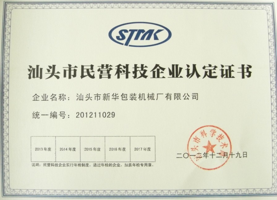 2012年12月19日,汕頭市新華包裝機械廠有限公司被汕頭市科學(xué)技術(shù)局認(rèn)定為“汕頭市民營科技企業(yè)”。