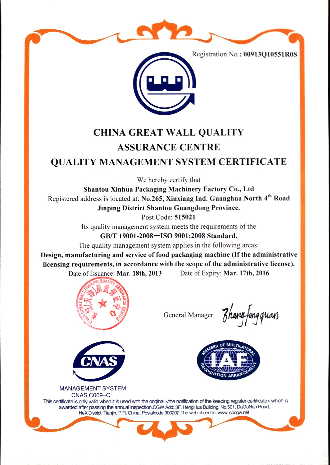 汕頭市新華包裝機械廠有限公司此次順利通過ISO9001:2008國際質(zhì)量體系認(rèn)證,將為進一步提升客戶服務(wù)、樹立品牌形象,提供更加有力的保障。